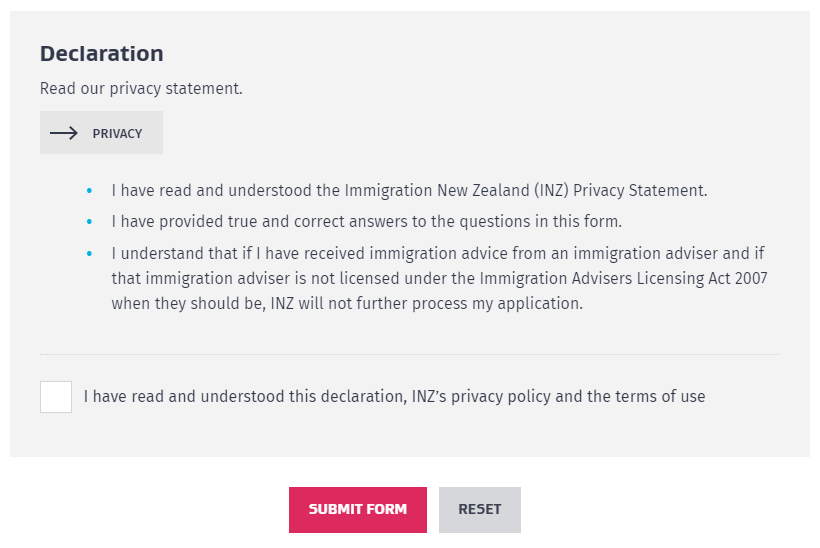 - He leído y comprendido el Declaración de Privacidad de Inmigración de Nueva Zelanda (INZ).