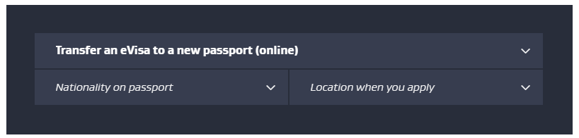 En el casillero debes buscar el trámite que corresponde, en este caso «Transfer an eVisa to a new passport (online)».
