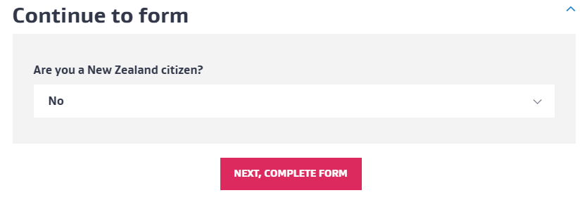 Tienes que ir al final de la página web y donde te pregunta si eres un ciudadano de Nueva Zelanda marca que NO, y clicas en el botón de continuar.