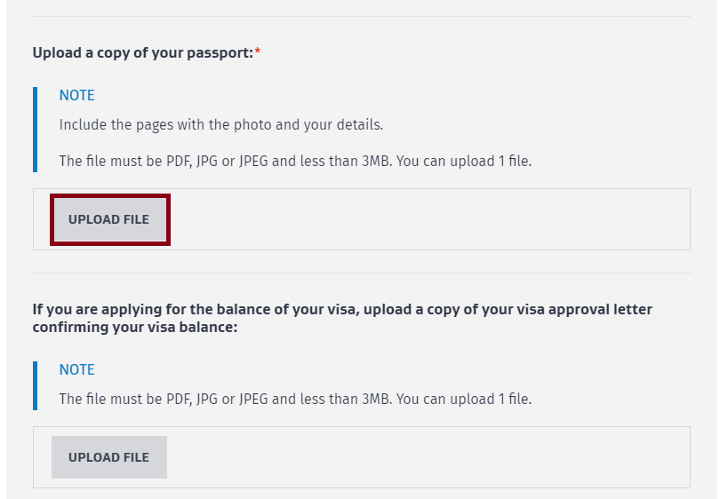 Adjunta la copia de tu nuevo pasaporte pinchando el botón de arriba «Upload File», ten en cuenta los límites de carga, 3MB, y el formato debe ser pdf, jpg, o jpeg. Solo podrás subir un archivo.
